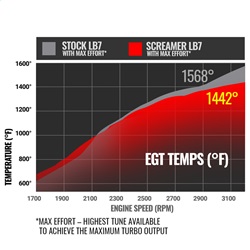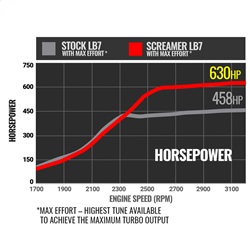 A drop-in, stock-appearing turbo for the Duramax LB7 which utilizes modern-day turbo technology. New compressor and turbine wheels have been designed to give you increased airflow without compromising on low end response. Every turbo has been balanced on a high speed VSR turbo balancer in order to safely increase your boost to 32psi. With supporting modifications, the LB7 Screamer is capable of up to 630hp and works with any 'box' tuner.