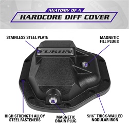 Yukon Hardcore Diff Covers are constructed from thick-walled, high-strength nodular steel to protect lockers, gears and axles from the most extreme hits in off road driving. They also increase the structural rigidity of the differential, reducing deflection under high-torque situations that can put severe loads on vital internal parts. Yukon Hardcore Diff Covers feature a durable powder coat finish and high strength steel fasteners for easy bolt-on installation. It's no secret that the underside of your rig can take a beating. Remember your diff! It's the lowest hanging fruit and very susceptible to damage… crack or break it and you're done for the day. Upgrade to a Yukon Hardcore Diff Cover and enjoy more peace of mind on the trail.