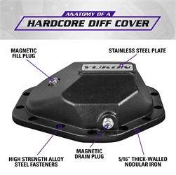 Yukon Hardcore Diff Covers are constructed from thick-walled, high-strength nodular steel to protect lockers, gears and axles from the most extreme hits in off road driving. They also increase the structural rigidity of the differential, reducing deflection under high-torque situations that can put severe loads on vital internal parts. Yukon Hardcore Diff Covers feature a durable powder coat finish and high strength steel fasteners for easy bolt-on installation. It's no secret that the underside of your rig can take a beating. Remember your diff! It's the lowest hanging fruit and very susceptible to damage⦠crack or break it and you're done for the day. Upgrade to a Yukon Hardcore Diff Cover and enjoy more peace of mind on the trail.